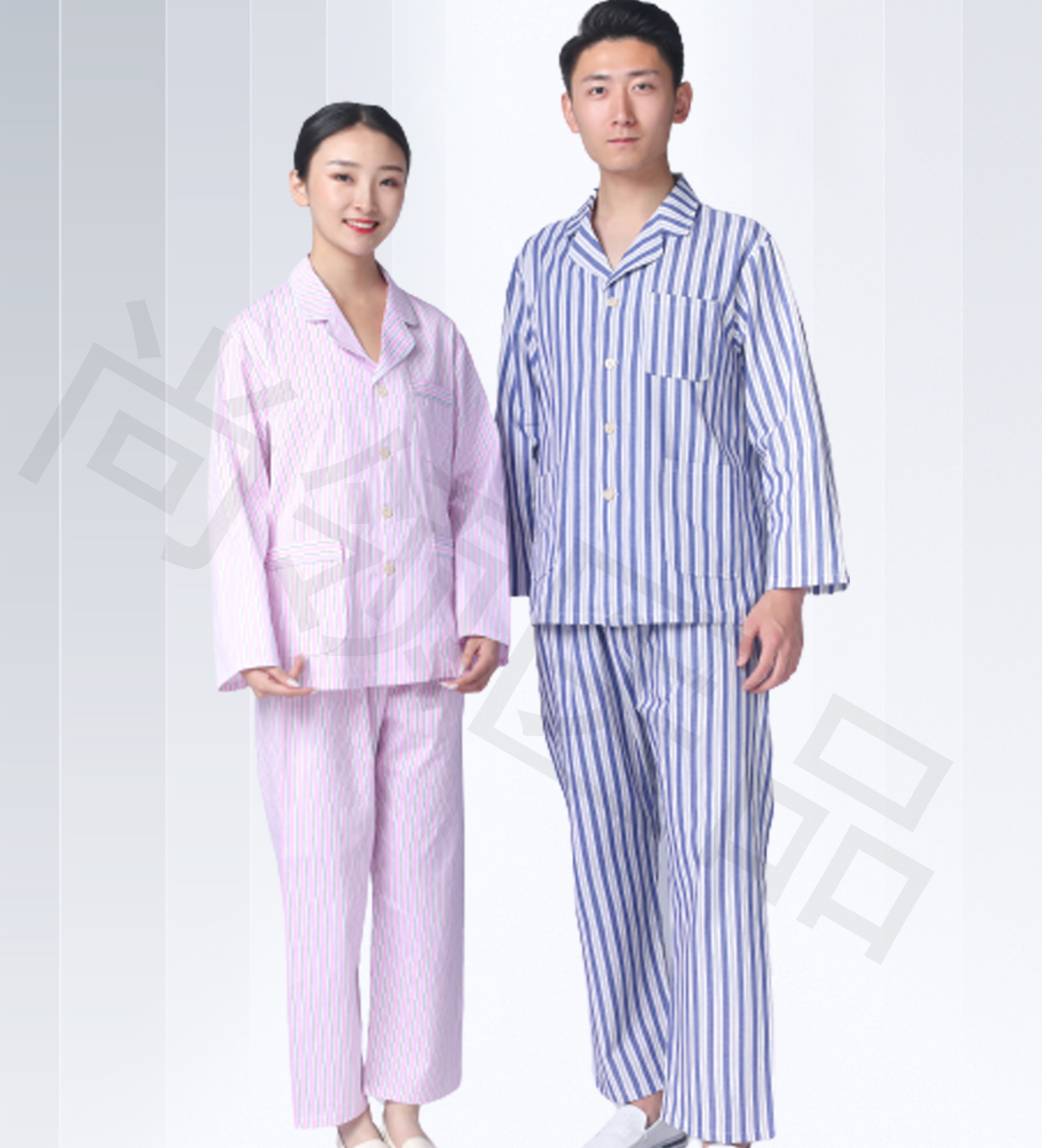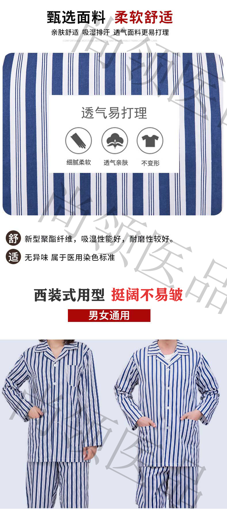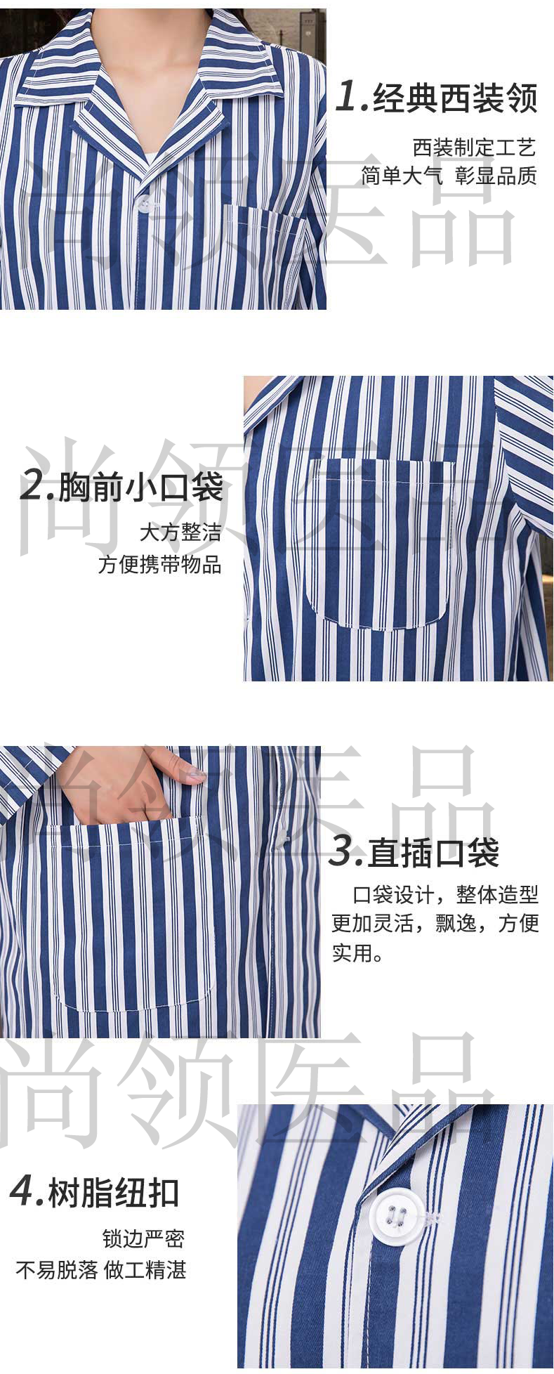 藍(lán)白條紋病員服是最常見(jiàn)的款式,在各大醫(yī)院里都能看到。采用了西裝領(lǐng)口簡(jiǎn)潔大方,簡(jiǎn)潔的袖口便于穿著,側(cè)面有口袋,既可裝飾又可儲(chǔ)物。