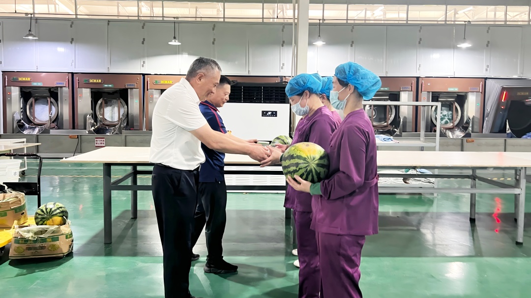 慰問團深入消毒供應中心、洗滌中心,看望奮戰在高溫一線的員工,將解暑物資送到大家手中,并與員工們親切交談,了解近期工作情況及高溫防護措施落實情況。對大家頂酷暑、保運轉的辛勤付出表示高度肯定。